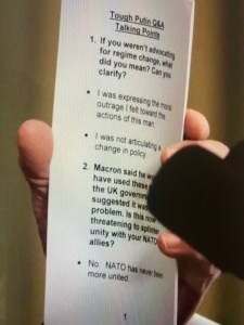 The index card sized “cheat sheet” shows that he was given the answer to a question that a reporter had asked him nearly verbatim. Here were the responses: