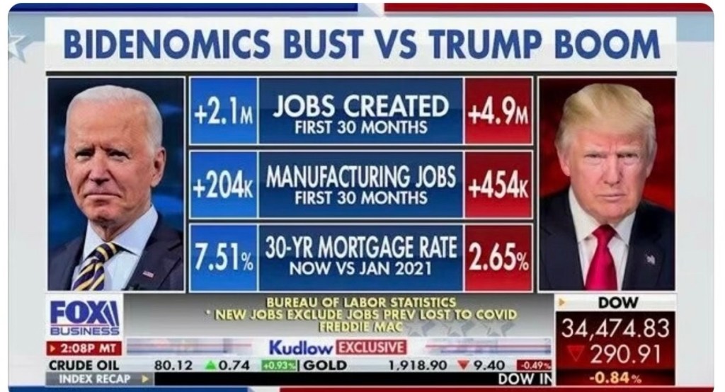 So ask yourself this: Who is the lesser of two evils? Biden the truth challenged, cognitively impaired, misogynistic, pedophilic, treasonous, money launderer? Or Trump, who did a number of great things while occupying the White House, but cannot control his actions and mouth, while facing years of being tied up in court as he fights against the bogus allegations drummed up by the Biden DOJ, FBI and CIA, which would impair his ability to govern. Interestingly, both Trump and Biden are both polling around 31% positive…77% of all Americans believe that “OldSlowJoe” is too old for another term and are fearful of a Kamala Harris run for the presidency, while 50% believe that Trump should end his run for the presidency.