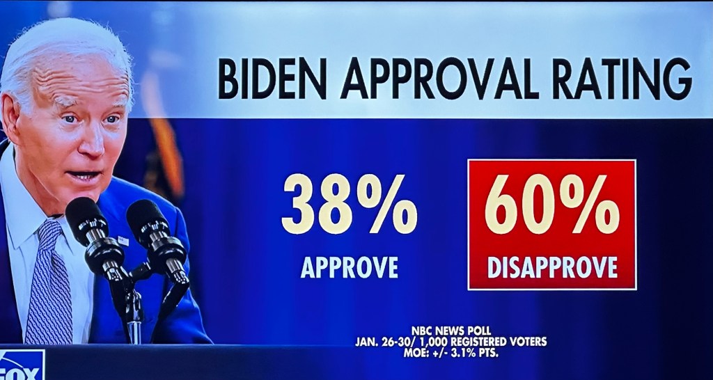 In a Monmouth University poll, Biden stands at a 34% approval rating with 61% giving Biden a thumbs down on his job performance. At this point in time, his poll numbers are at an all-time low in Monmouth polling since Biden took over the White House over three years ago. The polled voters are particularly concerned about SlowJoe’s handling of inflation and immigration, amongst other issues of his own doing. According to another Monmouth University poll, 76% of voters think Biden is too old to effectively serve another term, compared to only 48% who believe the same of Trump.