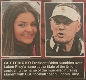 Furthermore, Biden displayed his callousness by failing to apologize, or even acknowledge, that he screwed up the murder victim’s name twice as “Lincoln Riley” during the same address. It took Representative Majorie Taylor-Green(R-GA), during Biden’s SOTU, to correct him by yelling for him to properly say Reily’s name. However, MTG served as the prime example regarding the loss of decorum in the Halls of The Congress, with the manner in which she conducted herself, similar in fashion to Representative Nancy Pelosi’s (D-CA) behavior during Trump’s SOTU’s. Her family, friends and traumatized fellow students deserve no less an apology for one of Biden’s all to familiar botch jobs.