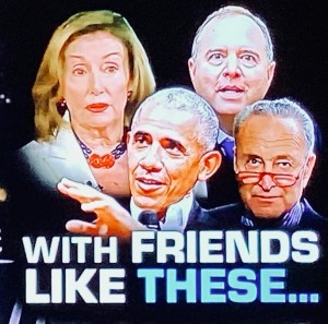 And I hope that the independents see with their own eyes the coverups and lies promulgated by the bootlicking, corporate dregs of the mainstream media and the indoctrinated, radical progressive left as Lyin’Joe sold out the United States. November 2024 will prove to be very different as former President Donald John Trump’s Populist movement puts the country on the comeback trail from the destroyer of American dreams, DementiaJoe, who may recused himself, “encouraged,” by the force of the Democratic elite: Obama, who’s the suspected “puppet master,” Chuckles Schumer, Jefferies, Pelosi and Adam “I have Russian evidence” Schiff, from the race to the White House.