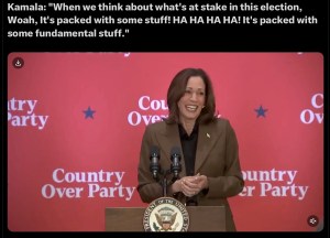 Kamala: “When we think about what’s at stake in this election, Woah, It’s packed with some stuff! HA HA HA HA! It’s packed with some fundamental stuff. I said that rather articulately!” A campaign stop in Arizona.