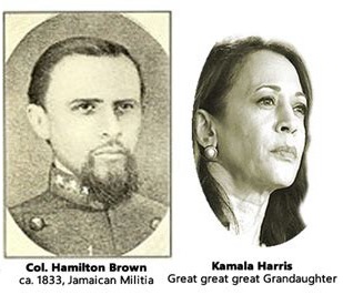 Brown became a prominent sugar planter and owner of slaves, according to one historical record. Brown died in 1843 at the age of 68, 46 years before Kamala Harris’s paternal great-grandmother Christiana Brown was born and 121 years before Harris’ birth. This would make it likely that the slave owner Brown was at least seven generations removed from Kamala. In 1807, slavery was outlawed in Jamaica, Brown illegally purchased white Irish slaves, which were later freed. Will Kamala Harris, the descendant of a slave owner, cut a check to fulfill her own words? Doubt it!