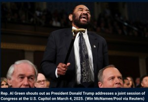The question before the speech began was how many Democrats would boycott? How would the Democratic members dress, including writing on their clothes? Would the Democrats hoot and holler, or maybe march out in an organized protest? Well, a little bit of each happened. One absolutely disrespectful insult to President Donald John Trump, and to the Office of the President, was the shenanigans of Representative Al Green (D-TX), and not the musician. Speaker of the House Mike Johnson ordered the Sergeant at Arms to remove Green after he repeatedly shouted during Trump’s opening remarks. “Members are engaging in willful and continuing breach of decorum, and the chair is prepared to direct the Sergeant at Arms to restore order to the joint session,” Johnson warned as a handful of Democrats repeatedly disrupted POTUSDJT’s speech, with Green being the most egregious. Despite receiving numerous warnings, Green continued shouting and shaking his cane at Trump. Eventually, Johnson ordered the Sergeant at Arms to remove Green from the chambers. Green, one of Trump’s most vocal critics, already has filed impeachment articles against Trump over what he called “ethnic cleansing in Gaza.” So, you know where Green stands in regard to Israel defending herself against Hamas, Houthis, Hezbollah, Islamic Jihad and Iran. Green was censured and entered into the Congressional Record.