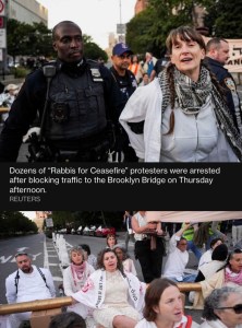 Another example of anti-Israel, pro-Hamas protests occurred when dozens of members of “Rabbis for Ceasefire” protesters were arrested after blocking traffic to the Brooklyn Bridge, according to authorities and sources. At least 56 demonstrators were arrested at the Yom Kippur event hosted by Rabbis for Ceasefire, a group of Rabbis and Rabbinical students protesting in support of Palestine and against Israel’s military action in Gaza. The NYPD surged in and collared dozens of the keffiyeh-wearing protesters, while many clapped and sang in Hebrew as cops played an audio warning that they would be charged with disorderly conduct. Another group of Jewish liberals who again fail to remember the history of the Jewish liberal Germans from the mid 1920’s. Yet I wonder how many were actually Jewish and not paid protesters?