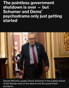 And a Democratic civil war continues to fester as they played games with the welfare of government employees, air traffic controllers, SNAP funding and even the military. At first, it was their “leverage” as they continued to blame POTUSDJT, who stuck to his word, for the shutdown. Now they are targeting Chuckles for caving in as the aforementioned eight Democratic senators flipped. The nation can now get back to business as the radical, progressive left and the bootlicking dregs of the legacy mainstream media continue to underestimate President Donald John Trump. And this is on the Democrats, solely!