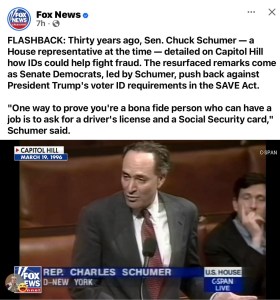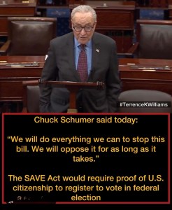 Chuckles, on the floor of the Senate stated: “I have said it before and I’ll say it again, the SAVE Act would impose Jim Crow-type laws to the entire country and is dead on arrival in the Senate. It is a poison pill that will kill any legislation that it is attached to… The SAVE Act is reminiscent of Jim Crow era laws and would expand them to the whole of America. Republicans want to restore Jim Crow and apply it from one end of this country to the other. It will not happen.” Many on social media quickly pointed to Schumer previously calling a Georgia election integrity law “Jim Crow 2.0” before the law resulted in record Black turnout in the 2022 state election.